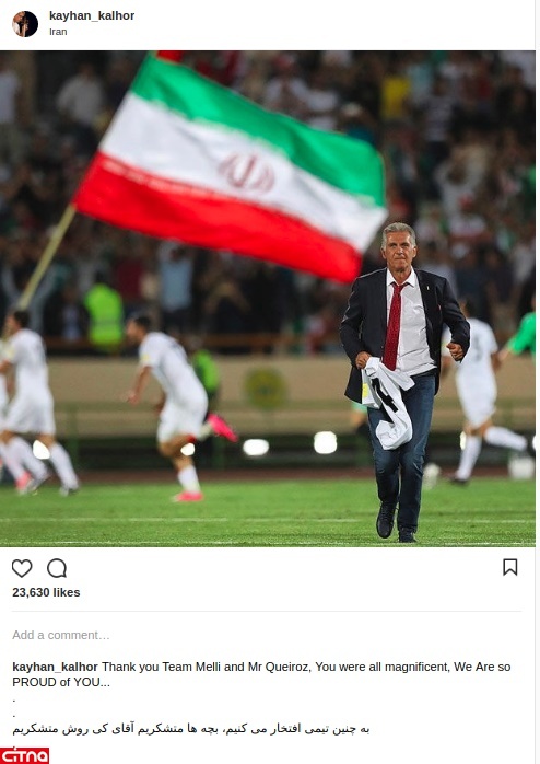 کیهان کلهر پس از پایان حضور ایران در جامجهانی از بچههای تیمملی و کارلوس کیروش تشکر کرد.