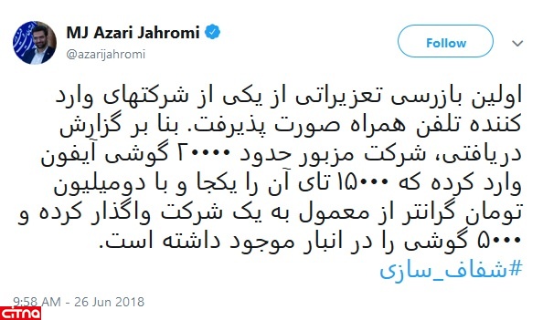 "اولین بازرسی تعزیراتی از یکی از شرکتهای واردکننده تلفن همراه صورت پذیرفت. بنا بر گزارش دریافتی، شرکت مزبور حدود ۲۰۰۰۰ گوشی آیفون وارد کرده که ۱۵۰۰۰ تای آن را یکجا و با دو میلیون تومان گرانتر از معمول به یک شرکت واگذار کرده و ۵۰۰۰ گوشی را در انبار موجود داشته است".