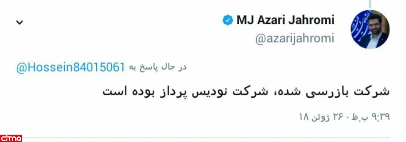 وزیر ارتباطات و فناوری اطلاعات دقایقی بعد از این توئیت و در پاسخ به توئیتی دیگر، شرکت بازرسی شده را "شرکت نودیس پرداز" اعلام کرد.