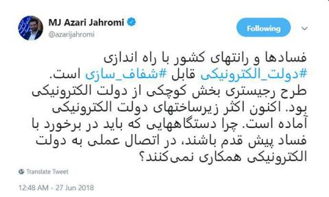 فسادها و رانتهای کشور با راه اندازی #دولت_الکترونیکی قابل #شفاف_سازی است. طرح رجیستری بخش کوچکی از دولت الکترونیکی بود. اکنون اکثر زیرساخت های دولت الکترونیکی آماده است. چرا دستگاههایی که باید در برخورد با فساد پیش قدم باشند، در اتصال عملی به دولت الکترونیکی همکاری نمیکنند؟