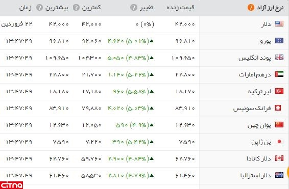 قیمت ارزها در بازار نیز رشدی قابل توجه را شاهد بودند. هر یورو به قیمت 9676 تومان و هر پوند به قیمت 10 هزار و 963 تومان معامله شد.