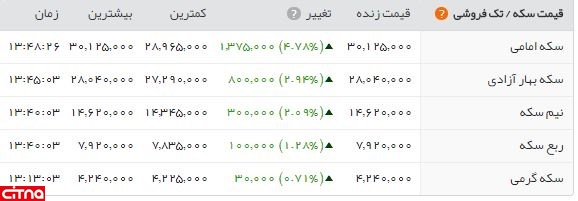 بر اساس این گزارش هر نیم سکه یک میلیون و 460 هزار تومان و ربع سکه نیز به قیمت 790 هزار تومان افزایش یافت.
