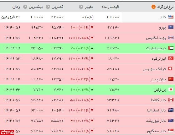 بهای ارزها امروز با کاهش اندکی در بازار همراه بود . هر یورو به قیمت 9603 تومان و هر پوند به قیمت 10 هزار و 854 تومان معامله می شود. جدول زیر نشان دهنده قیمت معاملاتی انواع سکه، ارزها معتبر و طلا در بازار تهران است.