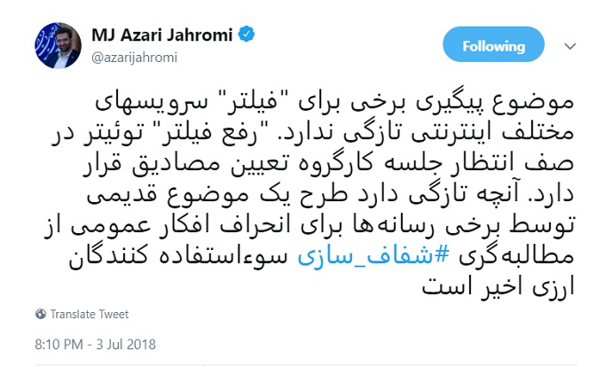 موضوع پیگیری برخی برای "فیلتر" سرویسهای مختلف اینترنتی تازگی ندارد. "رفع فیلتر" توئیتر در صف انتظار جلسه کارگروه تعیین مصادیق قرار دارد. آنچه تازگی دارد طرح یک موضوع قدیمی توسط برخی رسانهها برای انحراف افکار عمومی از مطالبهگری #شفاف_سازی سوءاستفاده کنندگان ارزی اخیر است.