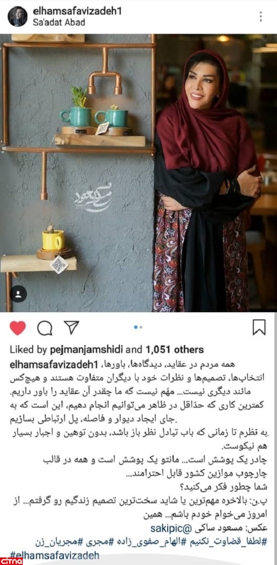 به گزارش سرویس وبگردی سیتنا، الهام صفوی زاده با انتشار عکس زیر در اینستاگرامش نوشت: همه مردم در عقاید، دیدگاهها، باورها، انتخابها، تصمیمها و نظرات خود با دیگران متفاوت هستند و هیچکس مانند دیگری نیست... مهّم نیست که ما چقدر آن عقاید را باور داریم. کمترین کارى که حدّاقل در ظاهر میتوانیم انجام دهیم، این است که به جای ایجاد دیوار و فاصله، پل ارتباطی بسازیم. ِبه نظرم تا زمانی که باب تبادل نظر باز باشد، بدون توهین و اجبار بسیار هم نیکوست.