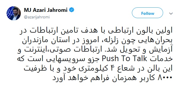 وزیر ارتباطات و فناوری اطلاعات، خبر داد: اولین بالون ارتباطی با هدف تامین ارتباطات در بحرانهایی چون زلزله، امروز در استان مازندران آزمایش و تحویل شد.