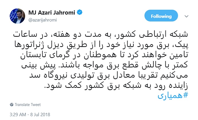 شبکه ارتباطی کشور، به مدت دو هفته، در ساعات پیک، برق مورد نیاز خود را از طریق دیزل ژنراتورها تامین خواهند کرد تا هموطنان در گرمای تابستان کمتر با چالش قطع برق مواجه باشند. پیش بینی میکنیم تقریبا معادل برق تولیدی نیروگاه سد زاینده رود به شبکه برق کشور کمک شود.