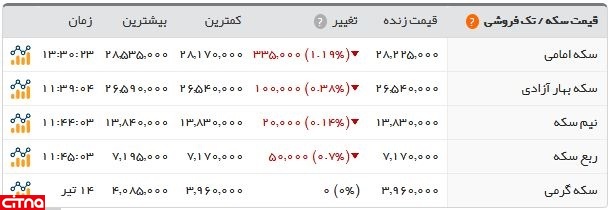 به این ترتیب، سکه امامی امروز در بازار با قیمت 2 میلیون و 822 هزار و 500 تومان، سکه بهار آزادی 2 میلیون و 654 هزار تومان، نیمسکه یک میلیون و 383 هزار تومان، ربعسکه 717 هزار تومان و سکه گرمی 396 هزار تومان بود.