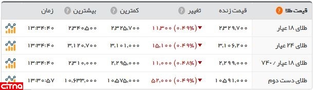 از سوی دیگر، هر گرم طلای 18عیار در بازار با افت قیمت یکهزار و 130 تومان روبهرو شد؛ به طوری که با قیمت 232 هزار و 970 تومان به فروش رفت.