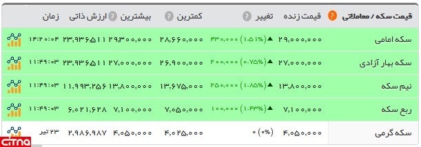 به این ترتیب، سکه امامی با قیمت 2 میلیون و 900 هزار تومان، سکه بهار آزادی 2 میلیون و 700 هزار تومان، نیمسکه یک میلیون و 380 هزار تومان، ربعسکه 710 هزار تومان و سکه گرمی 405 هزار تومان به فروش رفت.