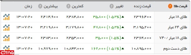 قیمت طلا نیز در بازار افزایش پیدا کرده؛ به طوری که هر گرم طلای 18عیار با قیمت 239 هزار و 640 تومان فروخته شد.