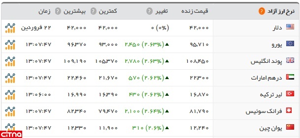 بر این اساس، یورو 9571 تومان، پوند انگلیس 10845 تومان، درهم امارات 2230 تومان، لیر ترکیه 1687 تومان و یوان چین 1224 تومان قیمت داشت.