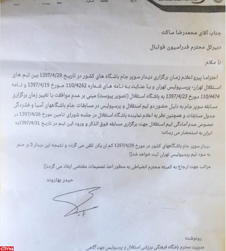 در نامهای که در اختیار باشگاه پرسپولیس قرار گرفته به صراحت اعلام شده با توجه به نظر نماینده باشگاه استقلال در جلسه تامین مبتنی بر عدم حضور در این بازی و بازگشت آبیها دو روز بعد از زمان اعلام شده به ایران، آنها در آن شرکت نمیکنند و پاسخ این درخواست برای لغو بازی نیز طی نامهای به باشگاه ارسال شده بود.