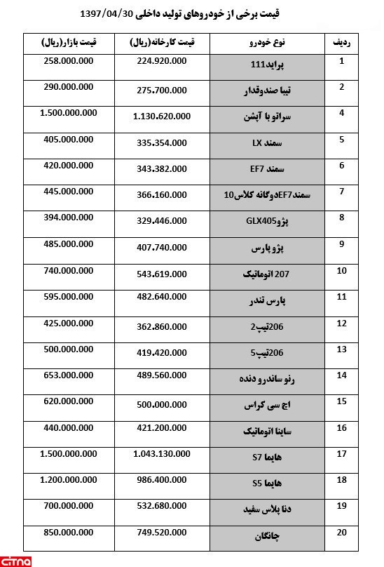 قیمت خودرو امروز ۱۳۹۷/۰۴/۳۰|نوسان ۱۰۰ تا ۵۰۰ هزار تومانی