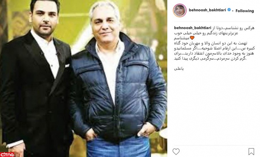 پست اینستاگرامی بهنوش بختیاری برای مدیری و علیخانی