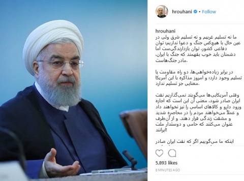 اینستاپست روحانی؛ امروز مذاکره با این آمریکا معنایی جز تسلیم ندارد