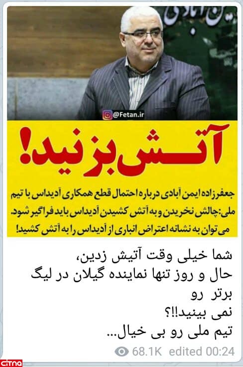 به گزارش سرویس وبگردی سیتنا، علی کریمی در پستی تلگرامی به گفته های جعفرزاده، نماینده مردم گیلان واکنش نشان داده این نماینده یکی از شهرهای استان گیلان در مجلس شورای اسلامی در واکنش به تحریم ایران از سوی آدیداس گفته بود یکی از انبارهای فروش این محصول در ایران را آتش بزنیم که علی کریمی هم درباره او گفته است: «شما خیلی وقت است که آتش زده اید. وضعیت تنها نماینده گیلان در لیگ برتر را نمی بینید؟»