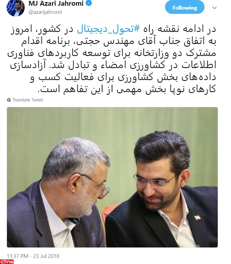 در ادامه نقشه راه تحول دیجیتال در کشور، امروز به اتفاق جناب آقای مهندس حجتی، برنامه اقدام مشترک دو وزارتخانه برای توسعه کاربردهای فناوری اطلاعات در کشاورزی امضاء و تبادل شد. آزادسازی دادههای بخش کشاورزی برای فعالیت کسب و کارهای نوپا بخش مهمی از این تفاهم است.