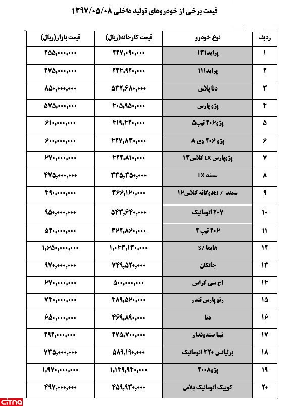 قیمت خودرو در بازار امروز بهشرح زیر است: