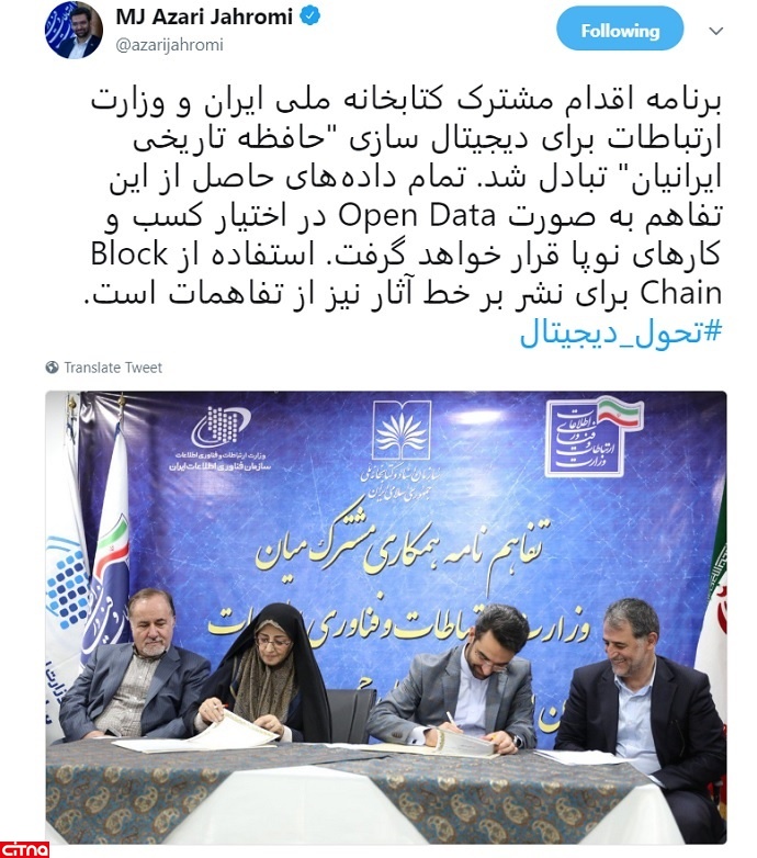 برنامه اقدام مشترک کتابخانه ملی ایران و وزارت ارتباطات برای دیجیتال سازی "حافظه تاریخی ایرانیان" تبادل شد. تمام دادههای حاصل از این تفاهم به صورت Open Data در اختیار کسب و کارهای نوپا قرار خواهد گرفت. استفاده از Block Chain برای نشر بر خط آثار نیز از تفاهمات است.