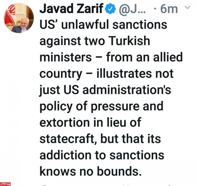 وزیر امور خارجه کشورمان در توئیتی تحریم آمریکا علیه ترکیه را محکوم کرد.