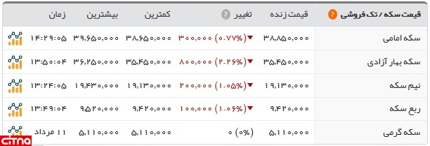 به این ترتیب، سکه امامی با قیمت 3 میلیون و 885 هزار تومان، سکه بهار آزادی 3 میلیون و 545 هزار تومان، نیمسکه یک میلیون و 913 هزار تومان، ربعسکه 942 هزار تومان و سکه گرمی 511 هزار تومان به فروش رفت.
