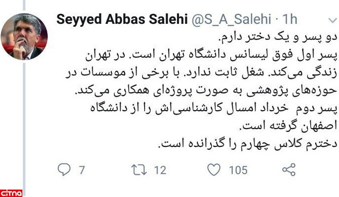به گزارش سرویس وبگردی سیتنا، سیدعباس صالحی، وزیر فرهنگ و ارشاد اسلامی با پیوستن به کمپین «فرزندت کجاست؟» در زیر حساب توییتری یکی از رسانهها توضیح داد: