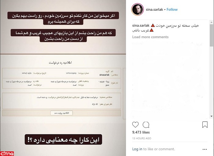 سینا سرلک از مجوز نگرفتن اثر جدیدش خبر داد و تصویری از پیغام مربوط به رد درخواستش را به اشتراک گذاشت و نوشت: