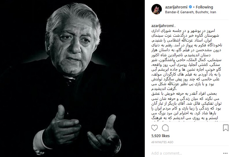 اینستاپست وزیر جوان برای درگذشت عزت سینمای ایران؛ آقای بازیگر زندگی را زیبا بازی و کام مردم ایران را بارها شاد کرد