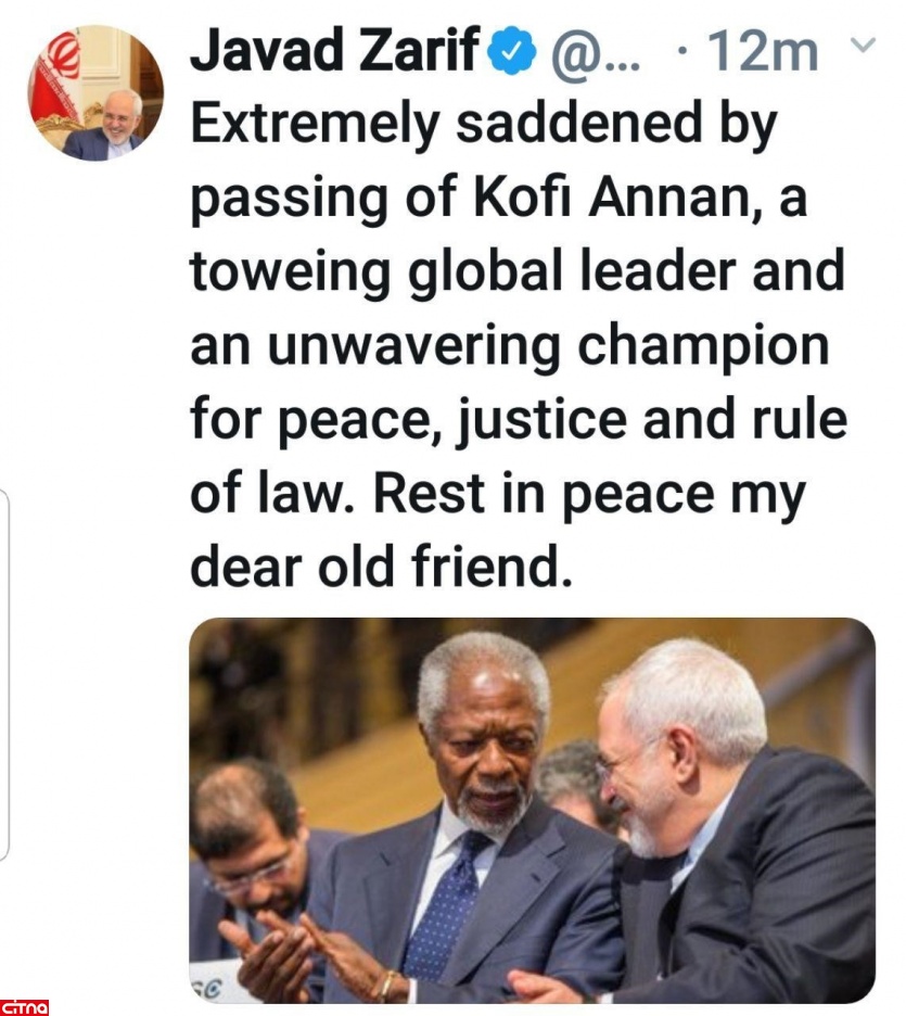 به گزارش سرویس وبگردی سیتنا، ظریف در پیامی توئیتری با ابراز تاسف عمیق از درگذشت دوست دیرینه خود "کوفی عنان" دبیرکل اسبق سازمان ملل متحد، از وی به عنوان رهبری بی نظیر و قهرمان صلح، عدالت و حاکمیت قانون یاد کرد.