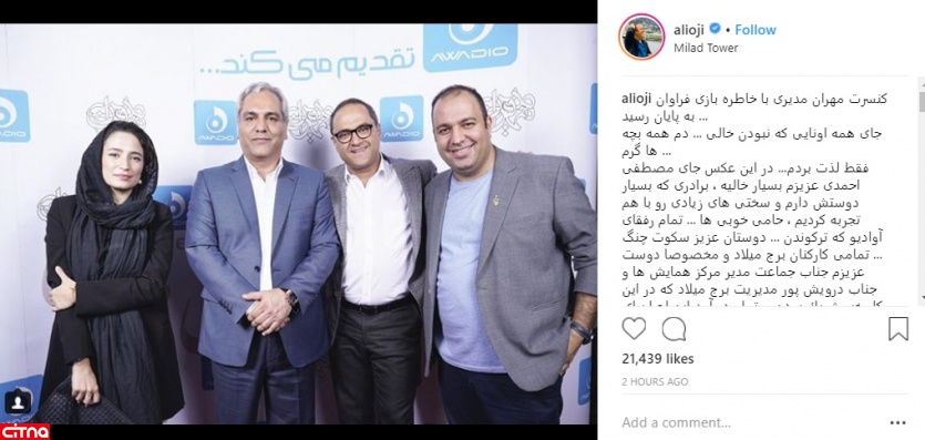 به گزارش سرویس وبگردی سیتنا، علی اوجی تصویری از خود، رامبد جوان، نگار جواهریان و مهران مدیری را در کنسرت این هنرمند در اینستاگرام منتشر کرد و در بخشی از توضیح آن نوشت: