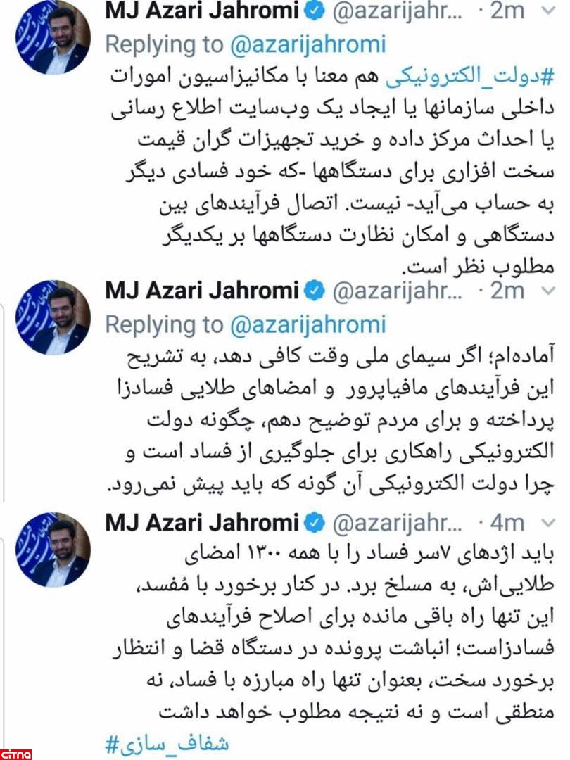 به گزارش سیتنا، مهندس آذری جهرمی در توئیت هایی پیرامون شفاف سازی از پشت پرده فسادها، نوشت: