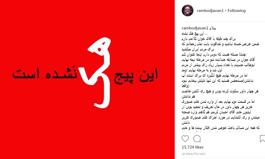 پس از مشخص شدن نتیجه این مسابقه، اتفاق غیرمنتظرهای رخ داد و صفحه رامبد جوان در اینستاگرام هک شد. هکر صفحه رامبد جوان، علت این اقدامش را عدم حمایت از شرکت کننده ی مورد علاقهاش خوانده و در این زمینه به نقد عملکرد جوان و همکارانش پرداخته است.