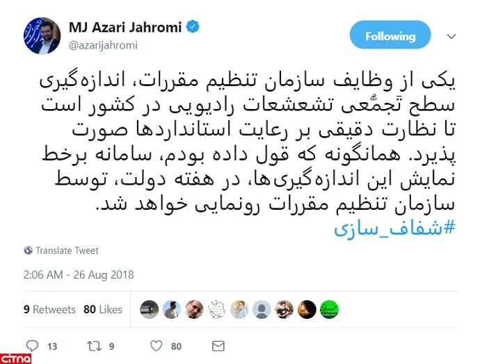 یکی از وظایف سازمان تنظیم مقررات، اندازهگیری سطح تَجمُّعی تشعشعات رادیویی در کشور است تا نظارت دقیقی بر رعایت استانداردها صورت پذیرد. همانگونه که قول داده بودم، سامانه برخط نمایش این اندازهگیریها، در هفته دولت، توسط سازمان تنظیم مقررات رونمایی خواهد شد.
