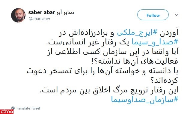 «آوردن ایرج ملکی و برادرزادهاش در صدا و سیما یک رفتار غیر انسانیست. آیا واقعا در این سازمان کسی اطلاعی از فعالیتهای آنها نداشته؟! یا دانسته و خواسته آنها را برای تمسخر دعوت کردهاند؟ این رفتار ترویج مرگ اخلاق بین مردم است.»