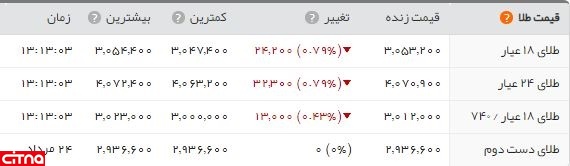 هر گرم طلای 18 عیار نیز با کاهش 2420 تومانی بر قیمت 305 هزار تومان تثبیت شد. طلای 24 عیار نیز به قیمت 407 هزار تومان فروخته می شود.