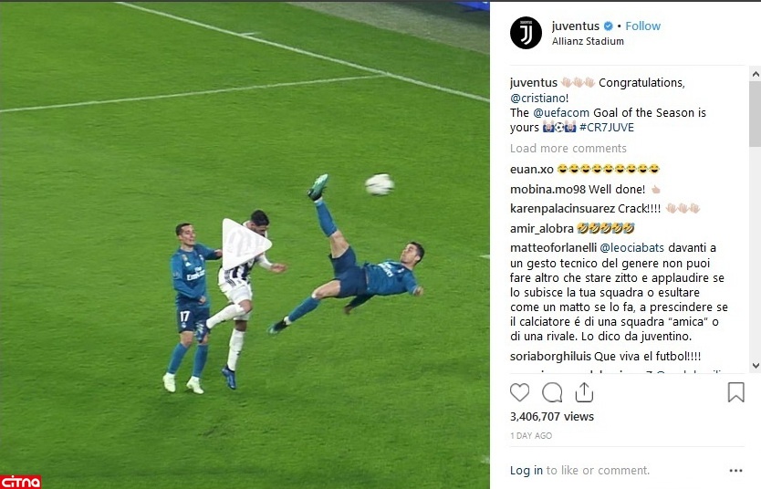 به گزارش سرویس وبگردی سیتنا، صفحه رسمی یوونتوس در اینستاگرام با انتشار فیلمی از گل زیبای رونالدو که فصل گذشته وارد دروازه بوفون شد، به کریس تبریک گفت.