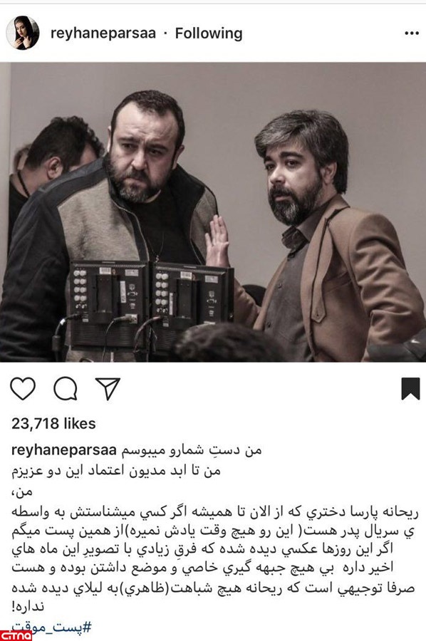 «من دست شما رو میبوسم...من تا ابد مدیون اعتماد این دو عزیزم... من، ریحانه پارسا دختری که از الان تا همیشه اگر کسی میشناستش به واسطه سریال پدر هست (این رو هیچ وقت یادش نمیره)