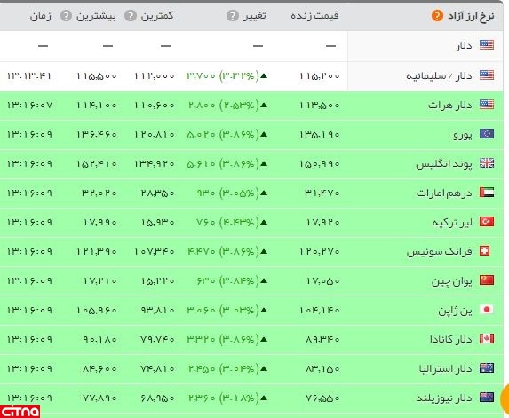 قیمت اغلب ارزها در بازار نیز با رشدی قابل توجه روبرو شد. دلار هرات امروز 11 هزار و 350 تومان و دلار سلیمانیه 11 هزار و 520 تومان قیمت خورد.