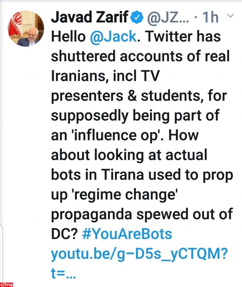 " سلام جک. توئیتر حساب کاربران واقعی ایرانی شامل مجری های تلویزیونی و دانشجویان را با فرض اینکه که بخشی از یک عملیات نفوذ هستند بست. چطور است به روبات های واقعی! در تیرانا که برنامه تبلیغی تغییر رژیم در ایران که از واشنگتن هدایت می شود را نشخوار می کنند، نگاهی بیاندازید؟ "