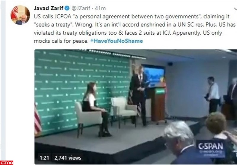 وزیر امور خارجه ایران پبام خود را با هشتگی با مضمون "آیا شرم نمی کنی" به پایان برده و ویدئویی نیز از اعتراضات یک زن آمریکایی در سخنرانی برایان هوک نماینده ویژه آمریکا در امور ایران را به پیام خود افزوده است.
