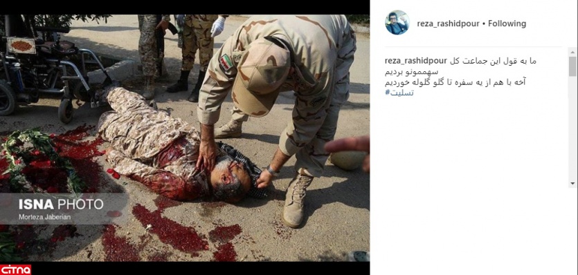 به گزارش سرویس وبگردی سیتنا، رضا رشیدپور مجری تلویزیون، با انتشار تصویری دردناک از یک جانباز در حادثه تروریستی صبح امروز اهواز در اینستاگرام، به نوشتن یک بیت شعر بسنده کرد و نوشت: