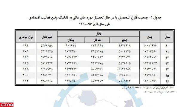 بر اساس گزارش مرکز آمار و مطالعات راهبردی وزارت کار، نرخ بیکاری جمعیت فارغالتحصیل یا در حال تحصیل دورههای عالی در سال ۱۳۹۶ برای گروه "مردان و زنان" در کل کشور ۱۹.۴ درصد، برای گروه "مردان" ۱۳.۵ درصد و برای گروه "زنان" ۳۰.۴ درصد بوده است.