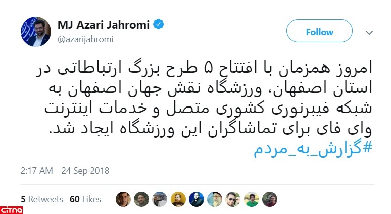 توئیت آذری جهرمی پیرامون افتتاح طرحهای بزرگ ارتباطاتی در استان اصفهان