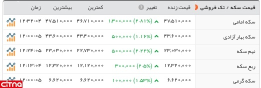 به گزارش خبرآنلاین، هر قطعه سکه تمام بهار آزادی طرح امامی با ۱۳۰هزار تومان افزایش قیمت به ۴میلیون و ۷۵۱هزار تومان رسید و هر قطعه سکه تمام بهار آزادی نیز با رشد ۵۰ هزار تومانی با قیمت ۴میلیون و ۳۶۰ هزار تومان معامله شد.