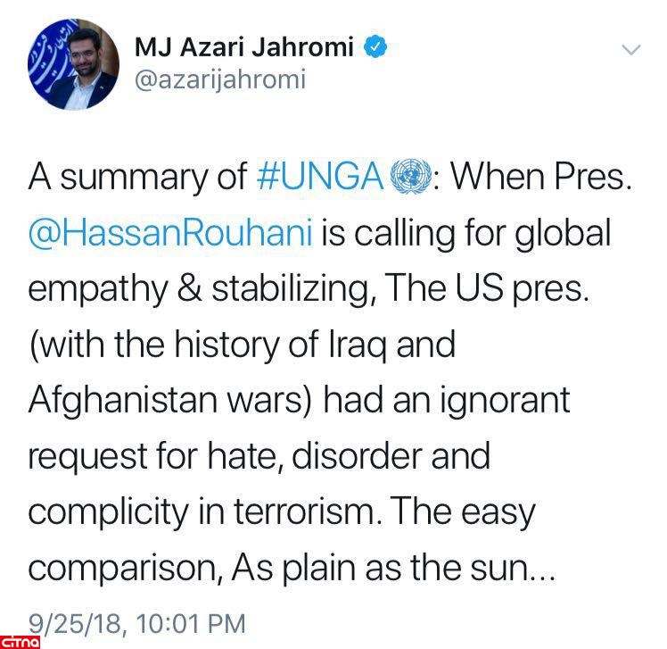 توئیت آذری جهرمی: روحانی در حال فراخوانی برای همدلی و ترامپ دنبال نفرت پراکنی است