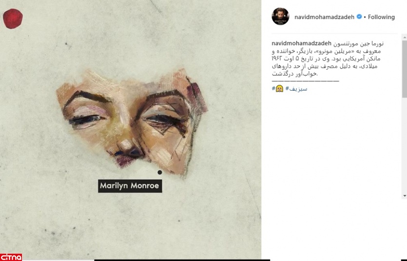 به گزارش سرویس وبگردی سیتنا، نوید محمدزاده با انتشار طرحی گرافیکی از مریلین مونرو بازیگر سینمای هالیوود در اینستاگرام نوشت: