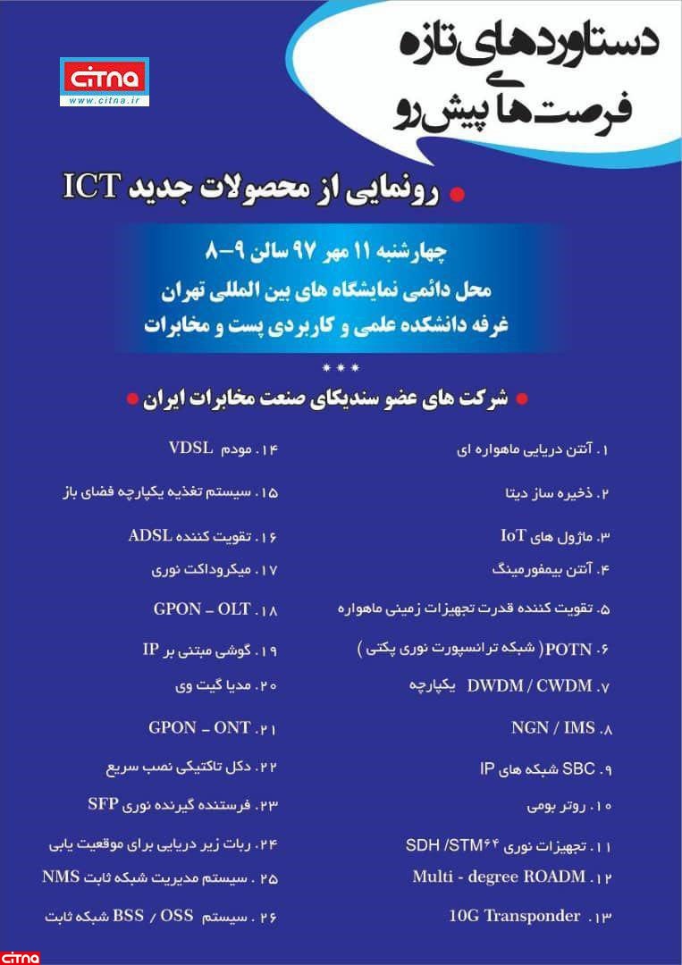 به گزارش سیتنا، 26 محصول جدید ICT شرکت های عضو سندیکای صنعت مخابرات ایران، چهارشنبه 11 مهرماه 97 و در نخستین روز برپایی نمایشگاه ایران تلکام 2018 در غرفهی دانشکدهی پست و مخابرات در این نمایشگاه رونمایی می شود.