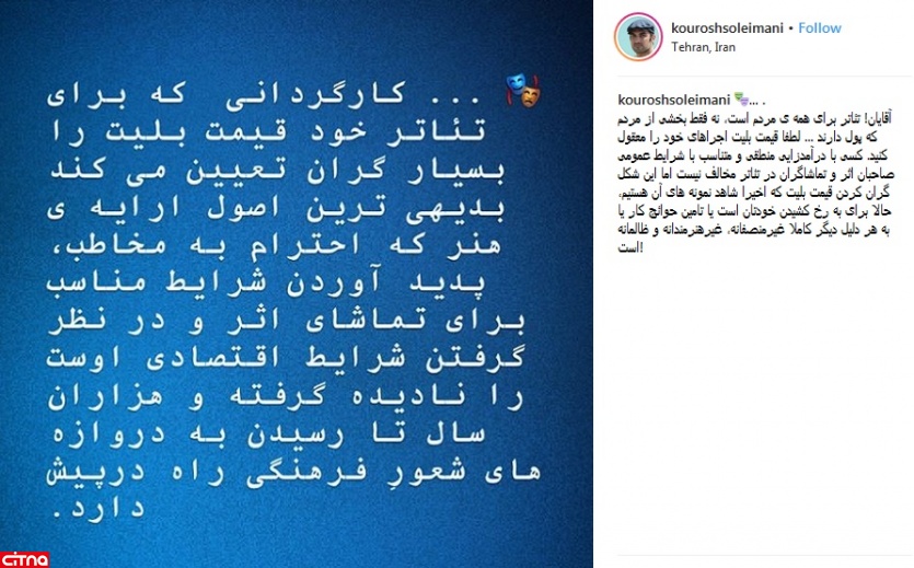 این روزها قیمت بالای بلیت چند نمایش صدای اعتراض تعدادی از اهالی هنر را درآورده است، کورش سلیمانی نیز در اعتراض به این اقدام پستی را در اینستاگرامش منتشر کرد.