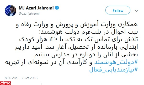 وزیر ارتباطات و فناوری اطلاعات، گفت: تلاش برای تماس تک به تک، با ۱۳۰ هزار کودک ابتدایی بازمانده از تحصیل، آغاز شد.